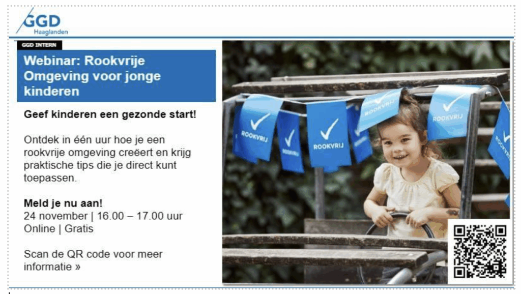 Op 24 november is er een praktisch en inspirerend webinar over hoe je een rookvrije omgeving voor jonge kinderen creëert. Werk je met jonge kinderen, ouders of gezinnen? Dan mag je dit niet missen!
